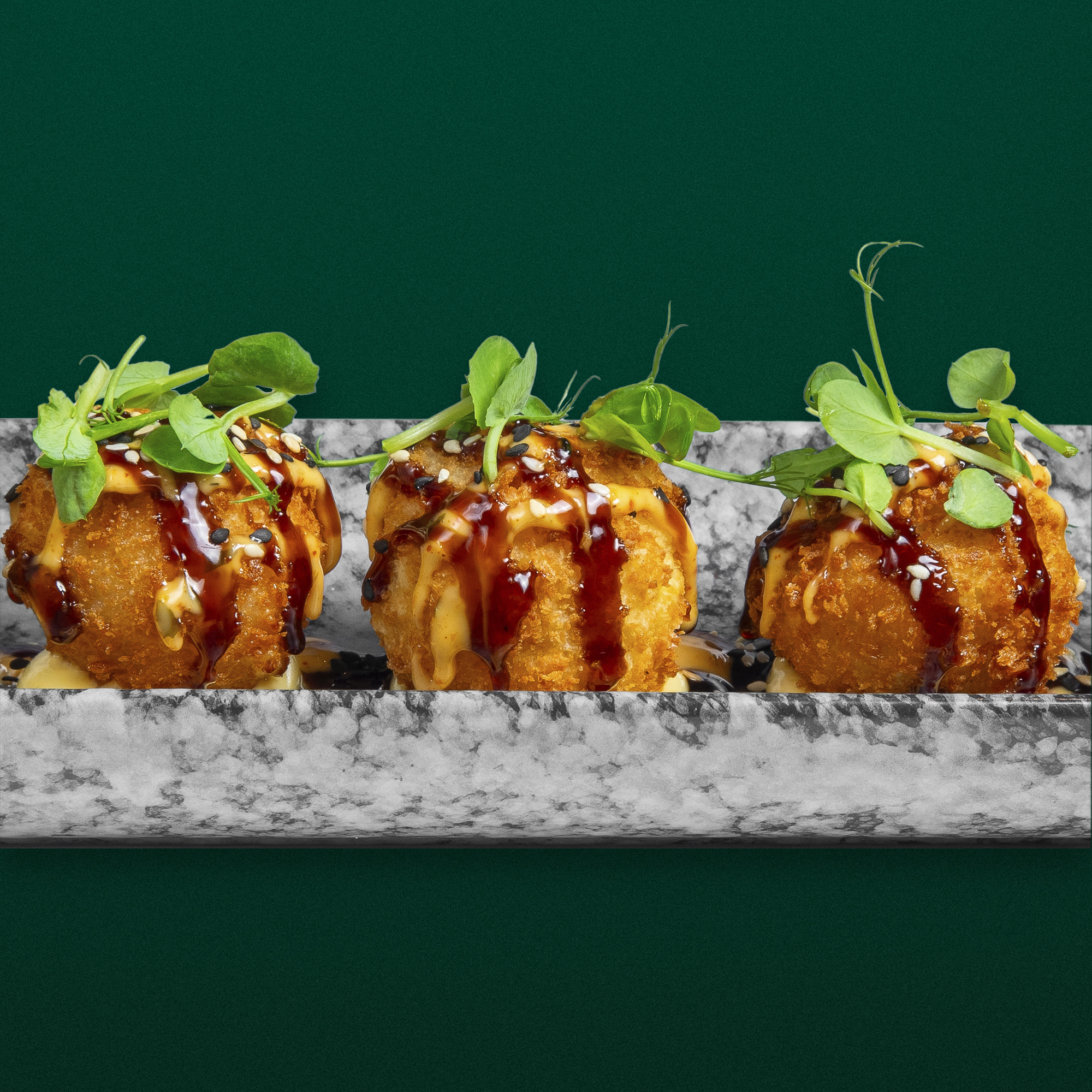 Panko tešloje gruzdinti tuno gabaliukai, kimchi padažas, sojos padažas, citrinų sultys